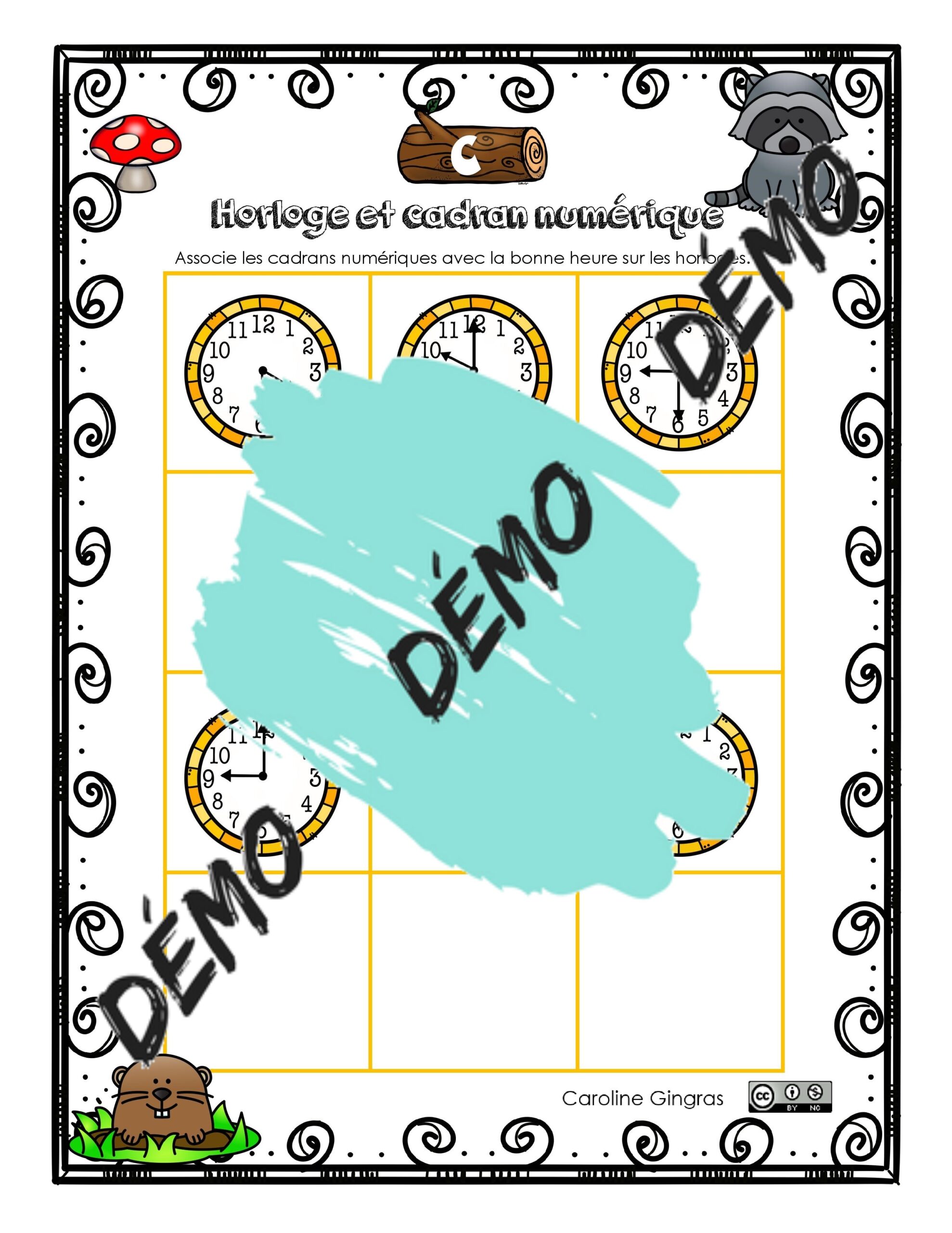 Voici un atelier qui travaille les heures. L’élève doit associer l’heure sur les cadrans numériques avec l’heure sur les horloges. On y présente les heures justes et les demi-heures. ( 10 pages)