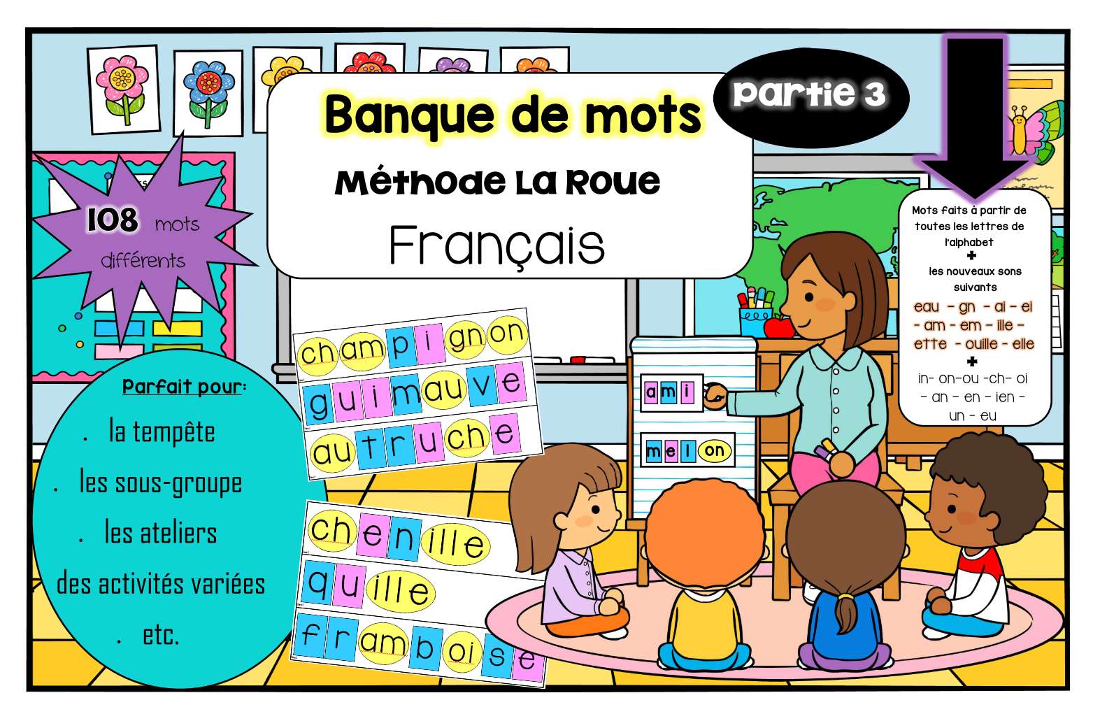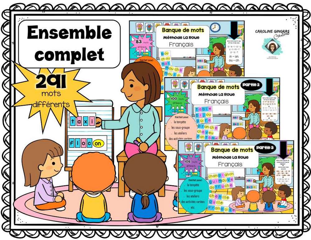 Voici le méga ensemble de 291 mots. À la base, cet outil a été créé pour me faciliter la tâche lors de l’activité de tempête (en lien avec la méthode La Roue). Par contre, il pourrait facilement être utiliser dans une grande variété d’activités: