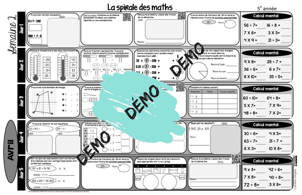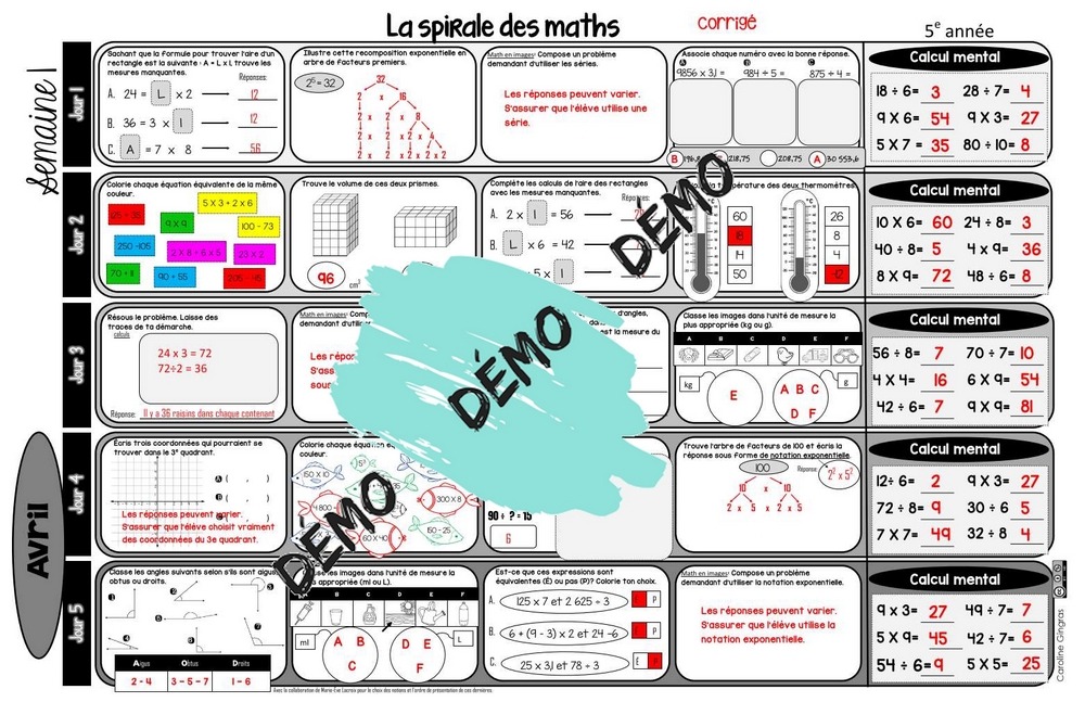 Voici le huitième mois de la spirale des maths pour les élèves de 5e année.